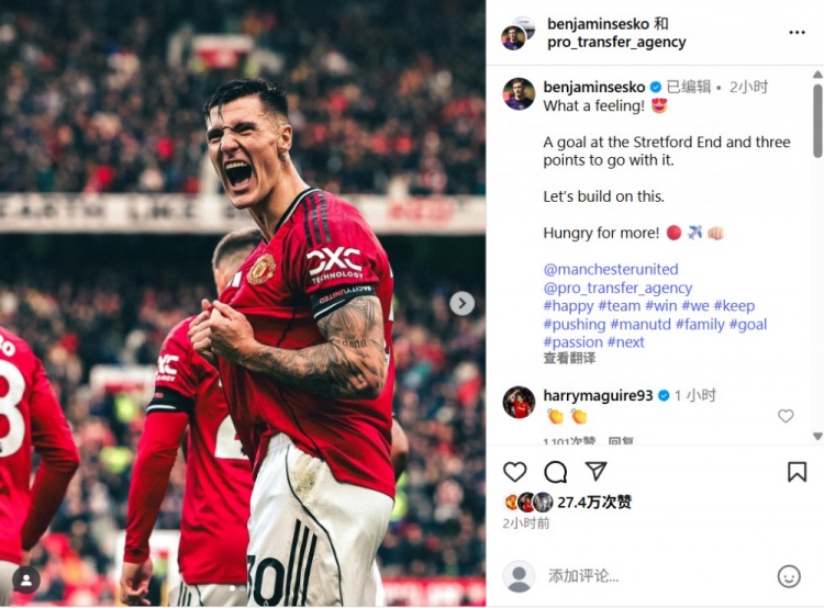 10月5日讯 本轮英超,曼联2-0战胜桑德兰。此役舍什科建功,苏超直播赛后球员更新社媒庆祝获胜 。