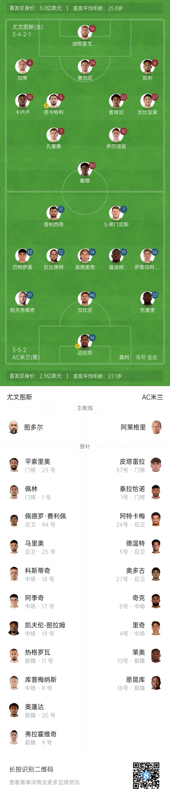 米兰后备 :37-皮塔雷拉、1-泰拉恰诺、24-阿特卡梅、5-德温特、27-奥多古、8-奇克、4-里奇、10-莱奥、18-恩昆库