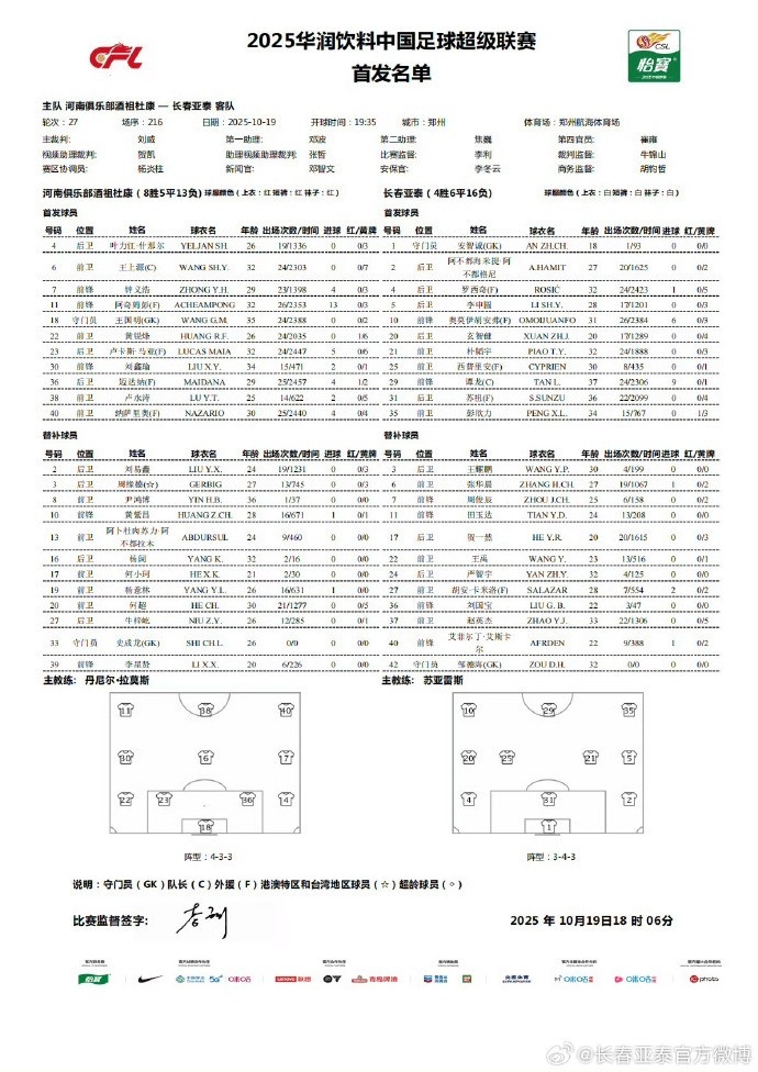 河南队vs长春亚泰杆位出炉,为长春我们一起战斗!