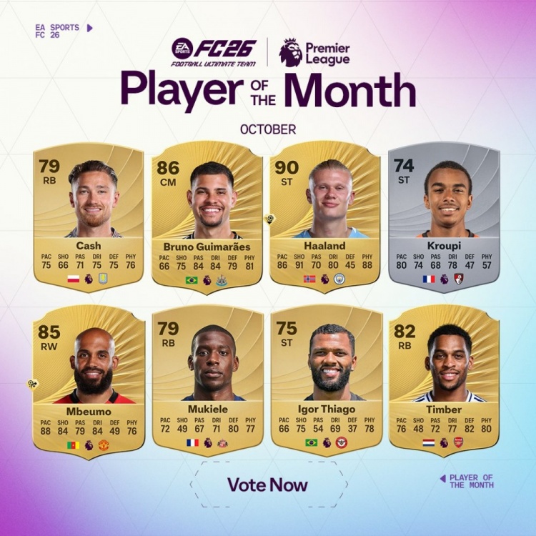 英超10月最佳8人候选名单:哈兰德、姆伯莫领衔,廷伯在列