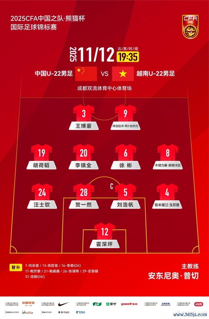11月12日讯 今日熊猫杯国足U22对阵越南,赛前杆位阵形 公布,苏超直播官方阵形 图如图。